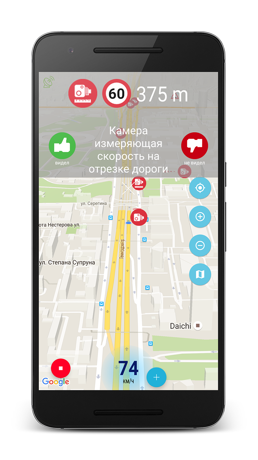 Приложение сообщит звуком и покажет на карте возникшую опасность, ее тип и расстояние до опасности.